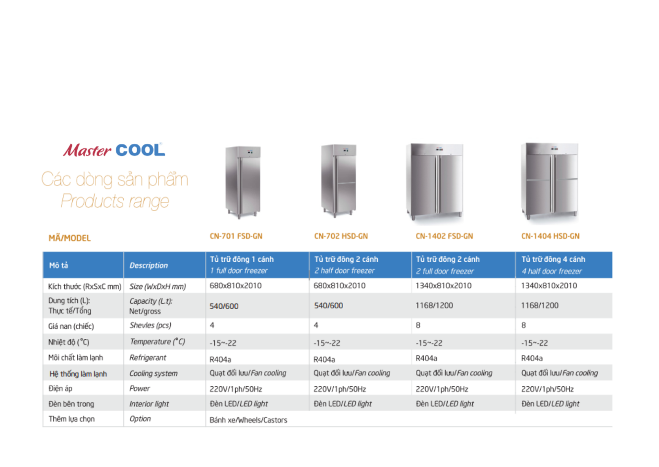 Thương hiệu MasterCOOL – thương hiệu thiết bị lạnh được phát triển bởi Hà Yến - đã và đang cung cấp một số dòng thiết bị tủ đông công nghiệp nổi bật sau: